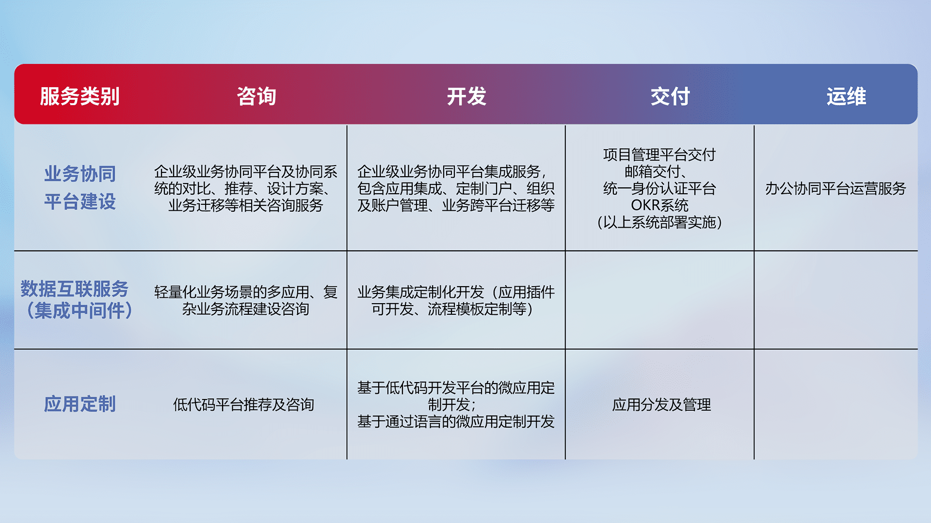 针对钉钉、、、企微、、IDaas等平台级产品提供产品的规划、、方案、、、、交付、、、定制化开发等服务,,实现如统一协同办公、、、智能客户服务、、、、混合会议管理、、、智能数据查询、、等业务场景,,,,实现数字化转型。。