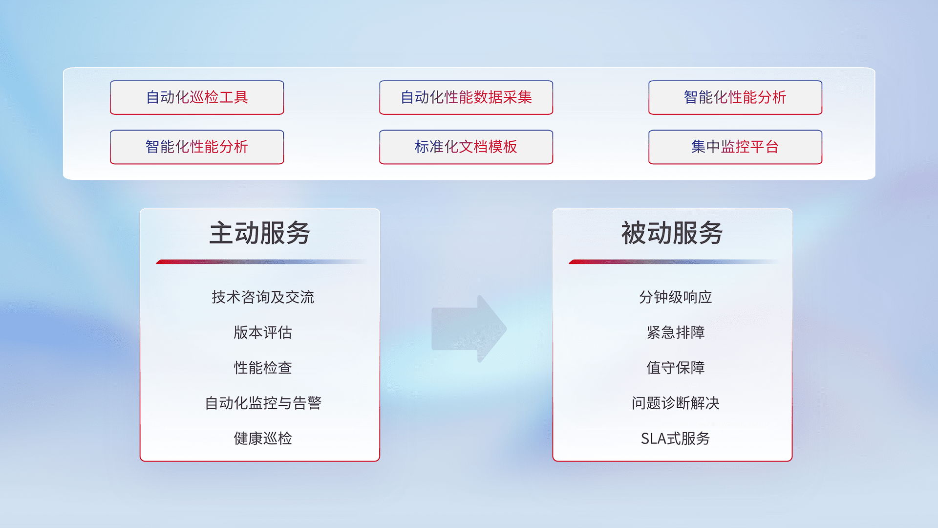 智能化工具和标准化文档,,保障服务质量,,,提供主动服务(包含技术咨询、、版本评估、、性能检查、、自动化监控与告警、、、健康巡检)和被动服务包含(分钟级响应、、、、紧急排障、、值守保障、、、、问题诊断解决、、SLA服务)。。